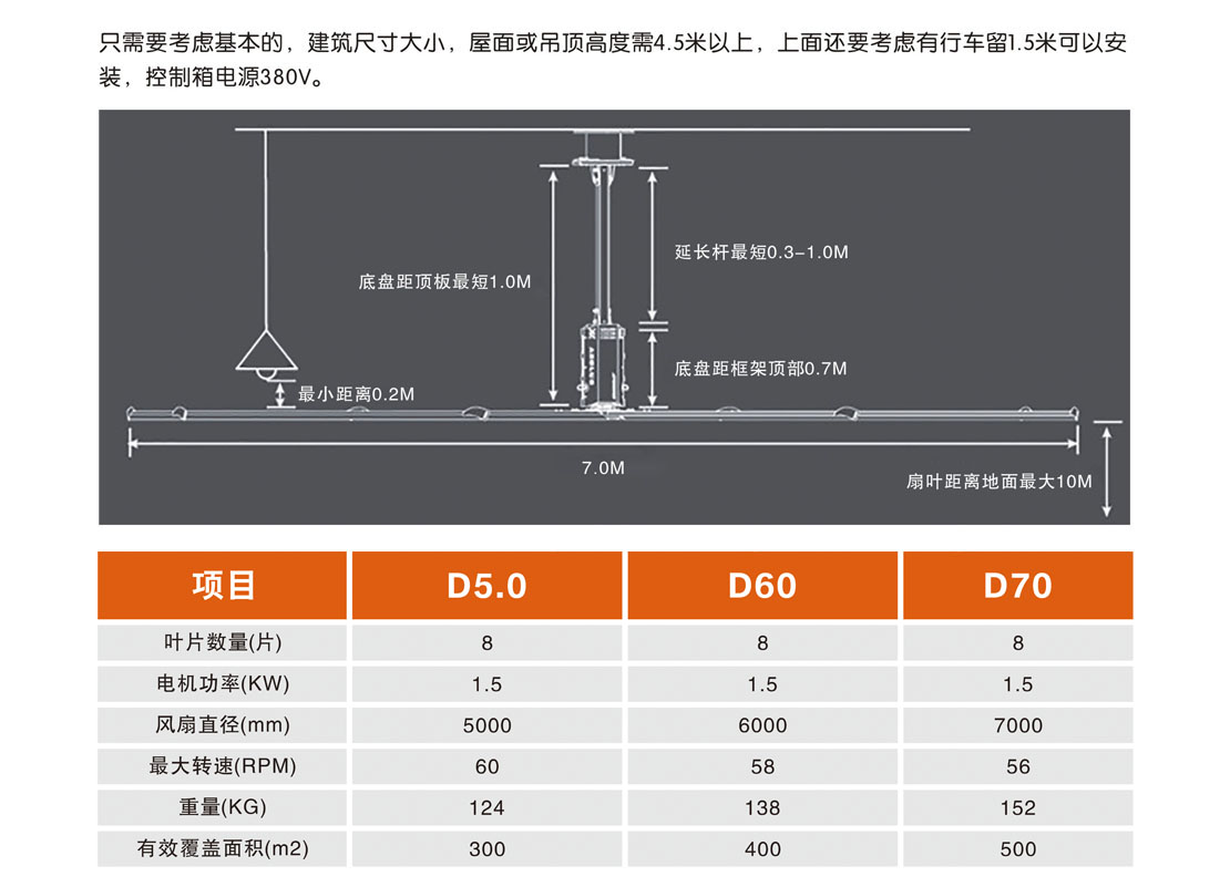 大型工業(yè)吊扇直徑達(dá)5-7米,功率為1.5千瓦,風(fēng)力柔和、無(wú)噪音,能滿(mǎn)足200-500平方米的室內(nèi)降溫、通風(fēng)等要求。